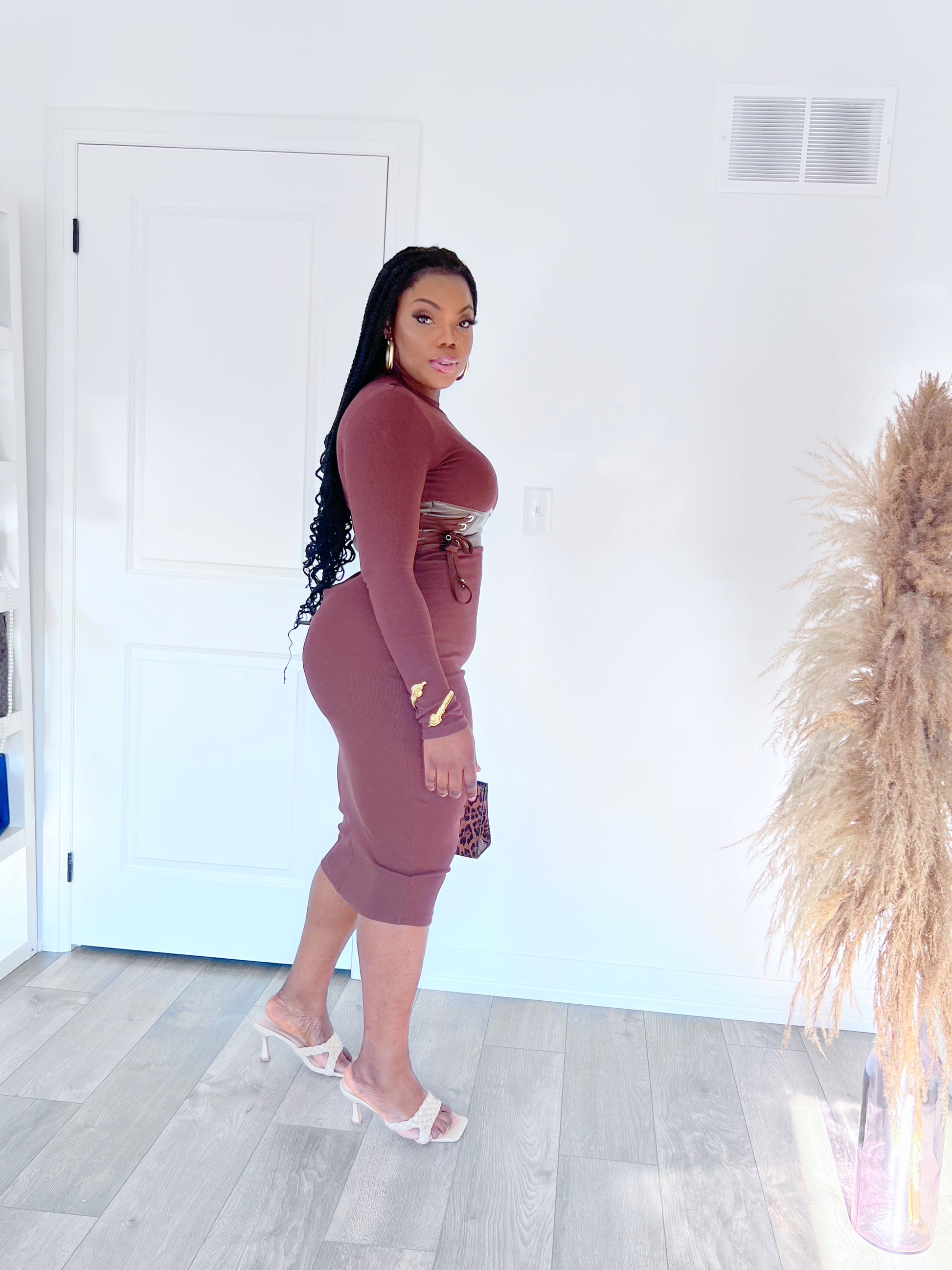 - Mock neck long sleeve Midi dress with attached faux leather corset detail and back zipper