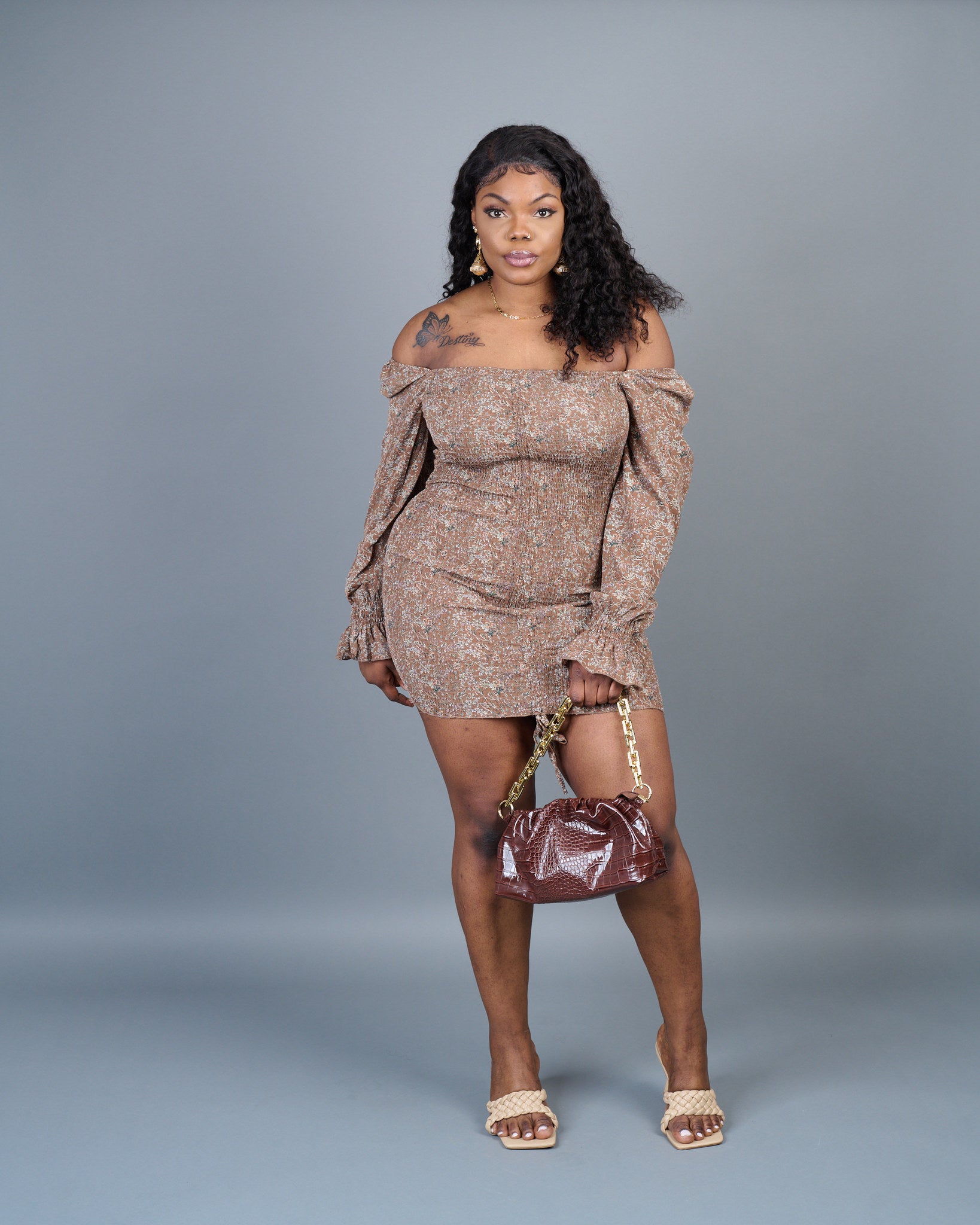 - Floral Smocked Off The Shoulder Bodycon Long Sleeve Dress