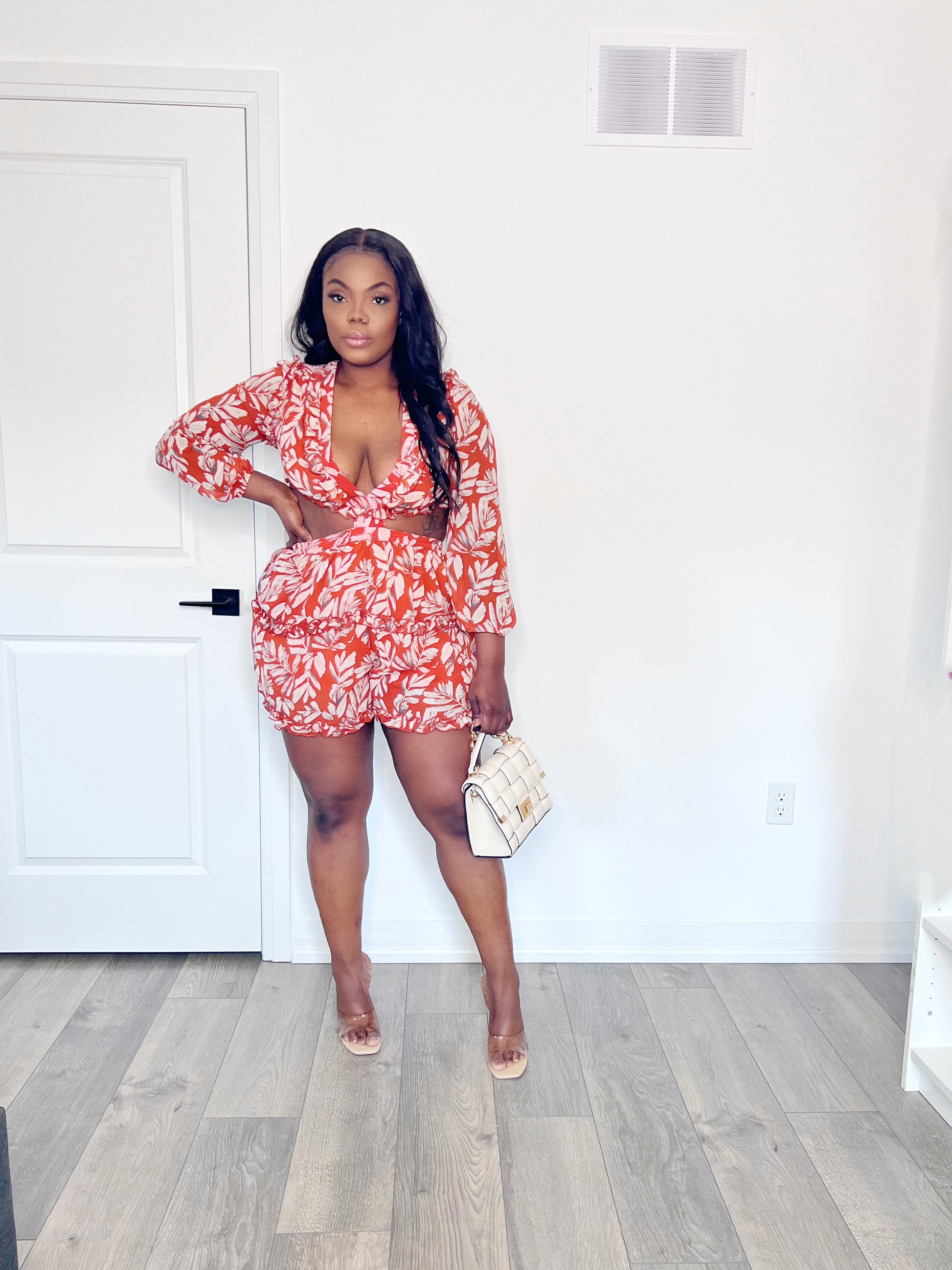 - Printed ruffled detail long sleeve romper