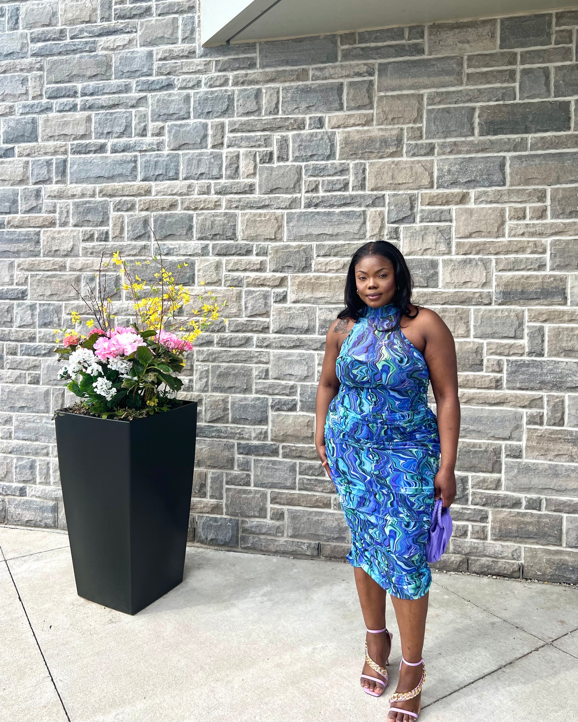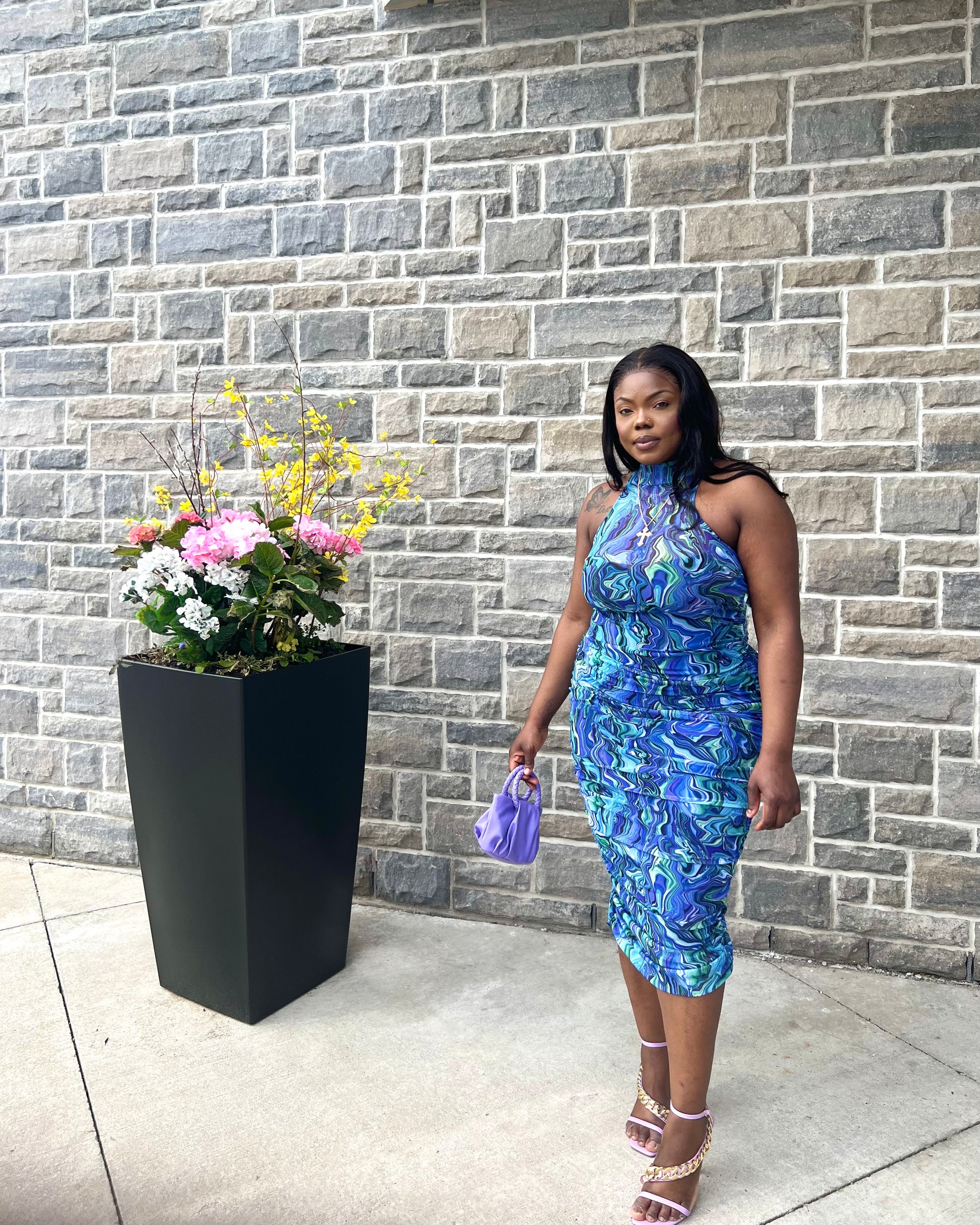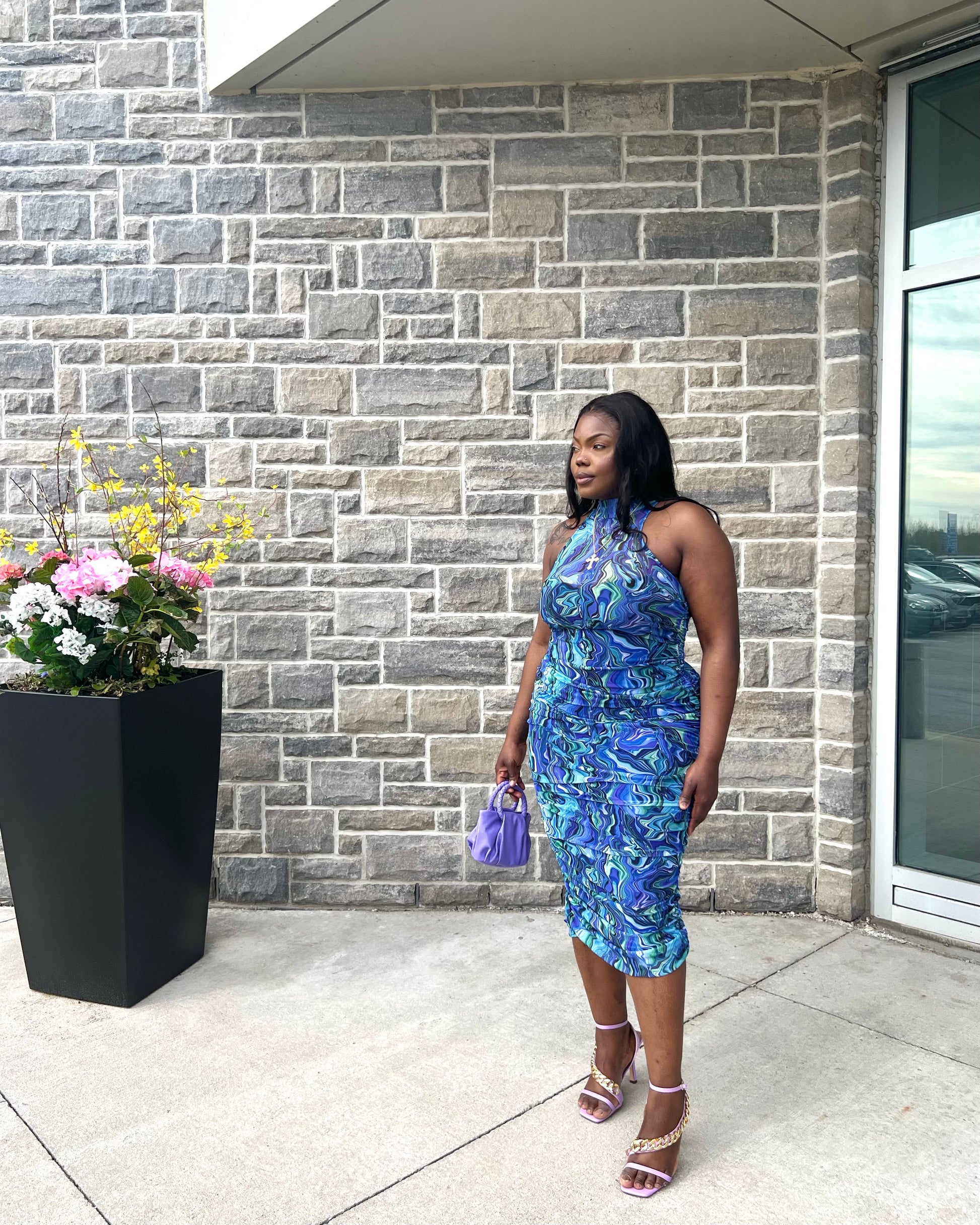- Multi-Color Marble Print Midi Dress, Ruched, Small Slit MESH PRINT