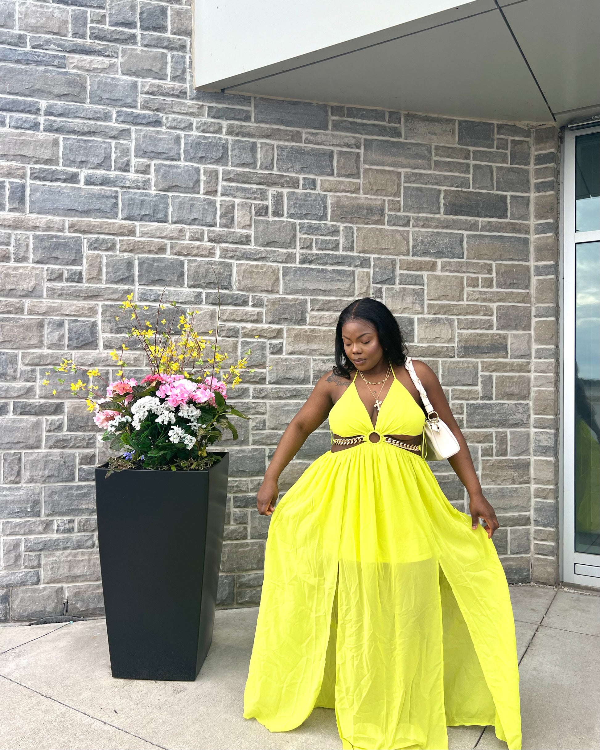 - chiffon cut out maxi dress chained waist slit front tie strap back